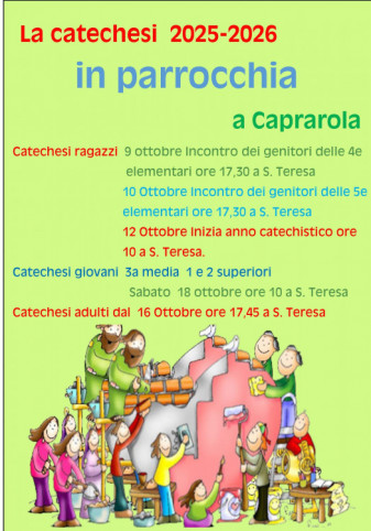 L’anno della catechesi inizierà la domenica 15 ottobre con la celebrazione dell’Eucare- stia delle ore 10,00 al duomo a cui sono invitati i ragazzi e i genitori. I genitori che hanno intenzione di far fare ai ragazzi altre attività durante la settimana tengano presente queste indicazioni sapendo che non è facile trovare i giorni disponibili per tutti e cioè catechisti, animatori, attività della parrocchia e attività varie dei ragazzi. Ovvio che per chi non è interessato alla crescita cristiana dei figli non ci sono mai giorni che andranno bene. Chi invece si rende conto che ci sono anche gli altri capisce e cerca di adeguarsi. L’invito è comunque rivolto a tutti…. La partecipazione alla vita della parrocchia è fondamentale per noi cristiani e partecipare vuol dire essere presente ed interessarsi della varie attività e proposte partecipando anche alla messa domenicale.