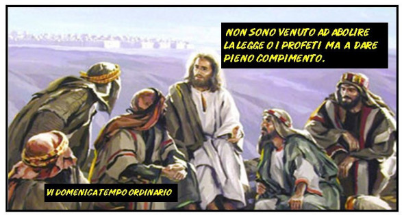 «Non crediate che io sia venuto ad abolire la Legge o i Profeti; non sono venuto ad abolire, ma a dare pieno compimento. In verità io vi dico: finché non siano passati il cielo e la terra, non passerà un solo iota o un solo trattino della Legge, senza che tutto sia avvenuto. Chi dunque trasgredirà uno solo di questi minimi precetti e insegnerà agli altri a fare altrettanto, sarà considerato minimo nel regno dei cieli. Chi invece li osserverà e li insegnerà, sarà considerato grande nel regno dei cieli.