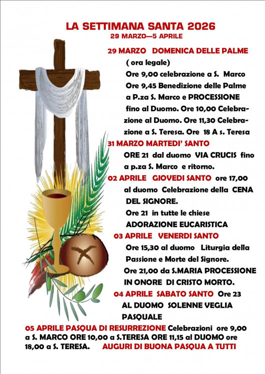 03 V Venerd' Santo ore 15,30 al Duomo Liturgia della Passione e morte del Signore. Ore 21 dalla chiesa di S. Maria Processione in onore di Cristo Morto
